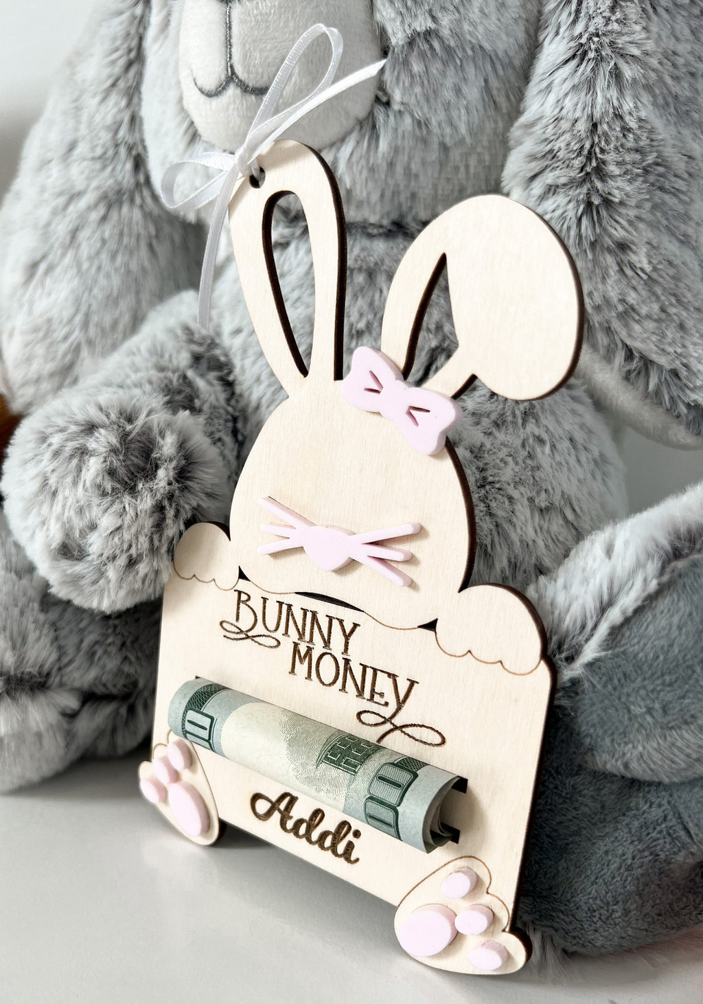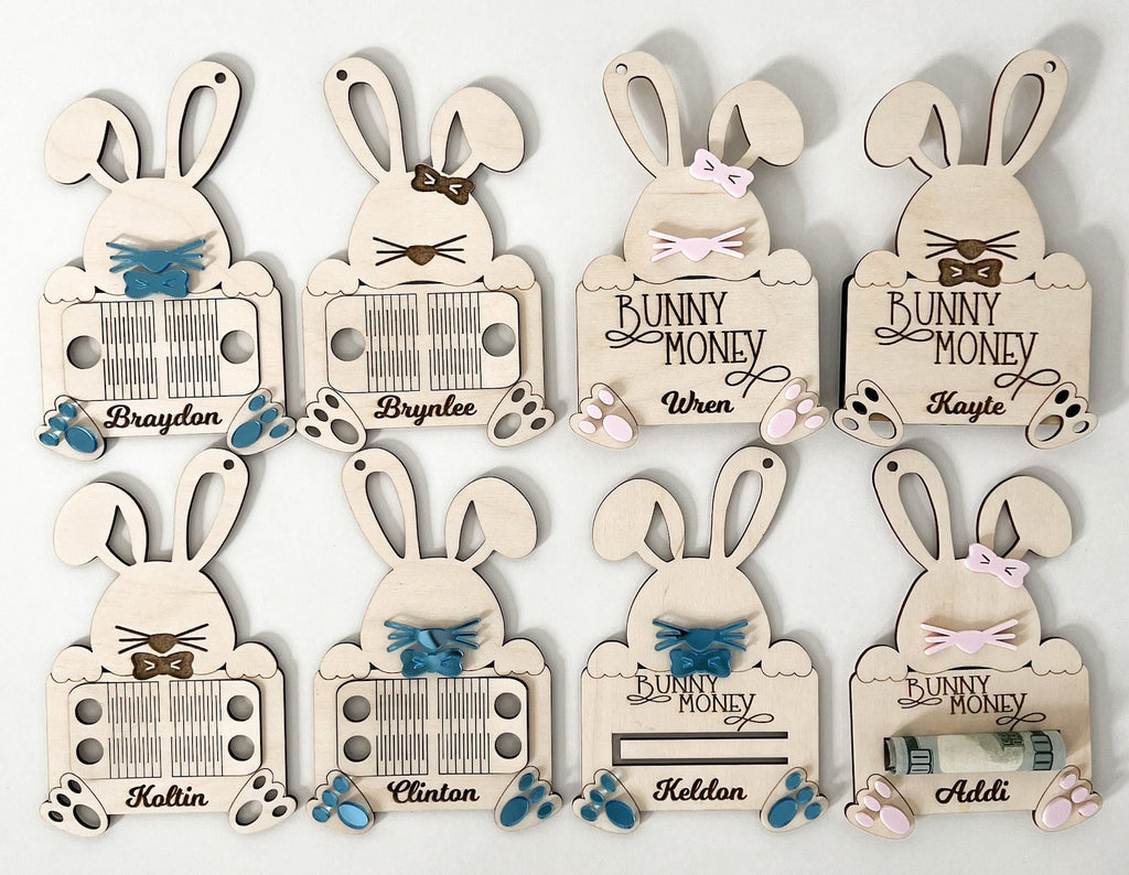 Personalize a gift to your littles with these cute money holders. Make Easter morning for your littles memorable with a little something for their piggy bank! Invest in their happiness! Layered bunnies will be painted wood and the color may vary from the image you see on your screen. Additional colors are available upon request. We will work with you to make your bunny the way you want it. We can also add more text (A year for example) upon request.