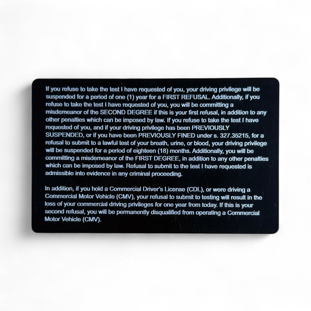This card is exclusive to Florida Highway Patrol for reading a DUI Admonition verbatim. These are laser engraved (Both Sides) .44mm metal cards that will withstand the daily demands of our FHP Officers.