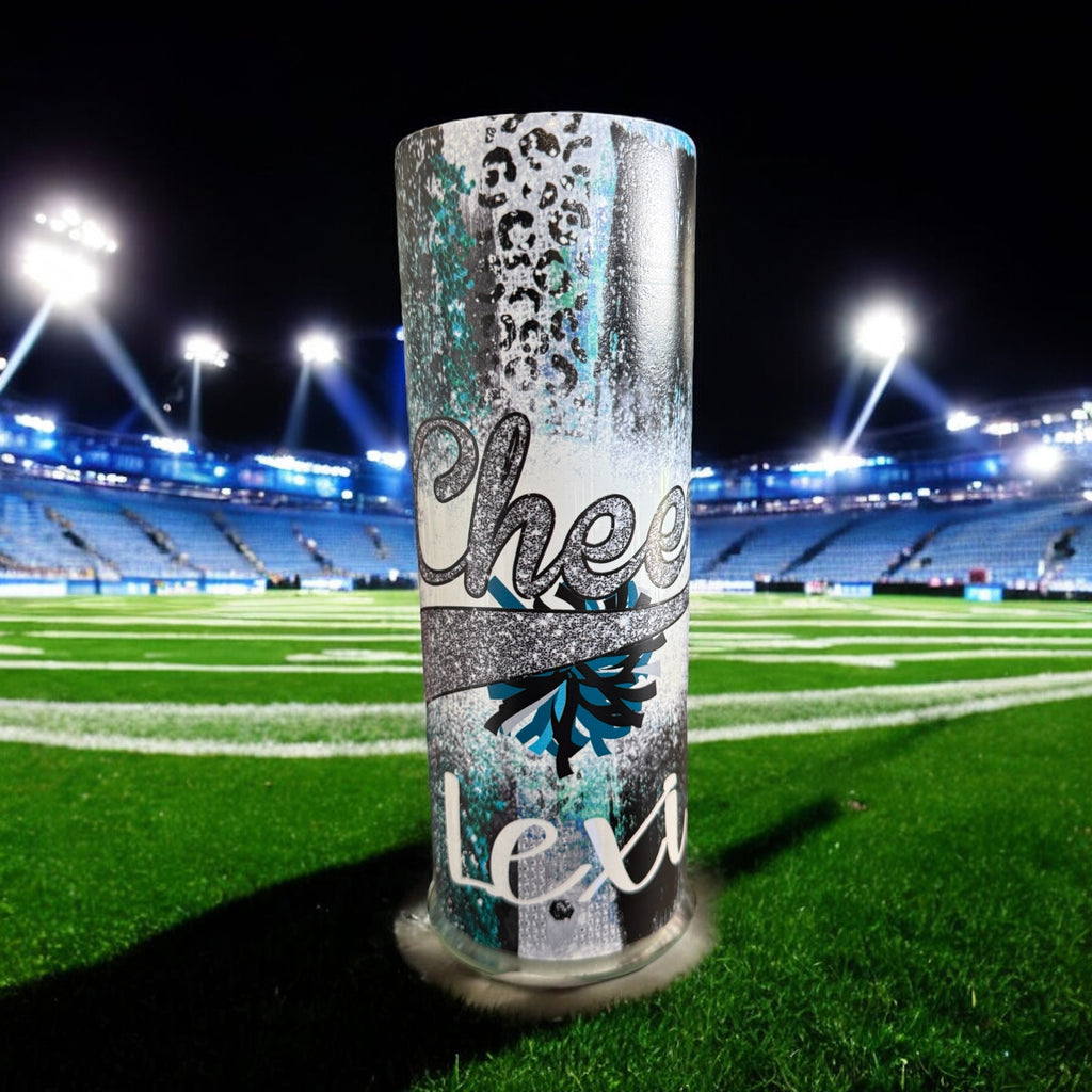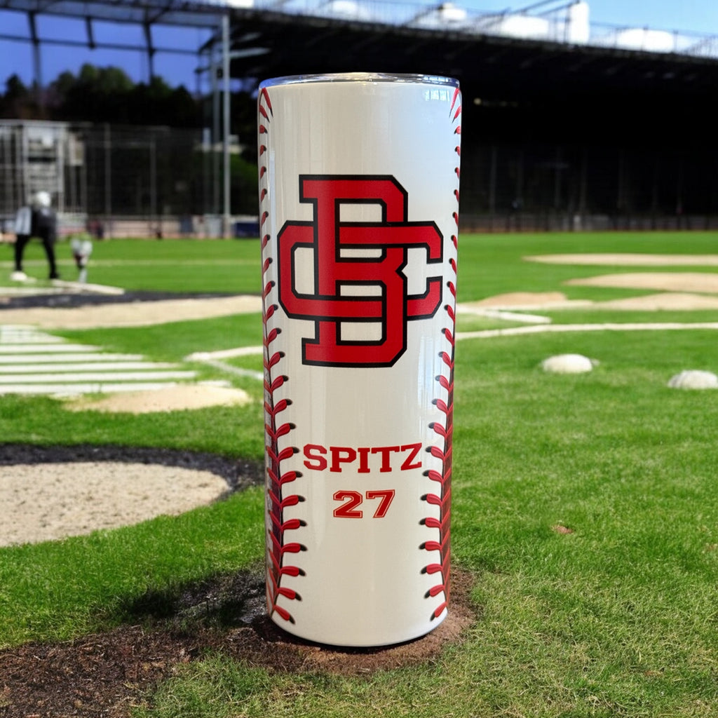 These tumblers are all the rage right now. We can help you design and personalize your tumbler today! These are 20oz skinny tumblers. They come with a lid and soft rubber base.