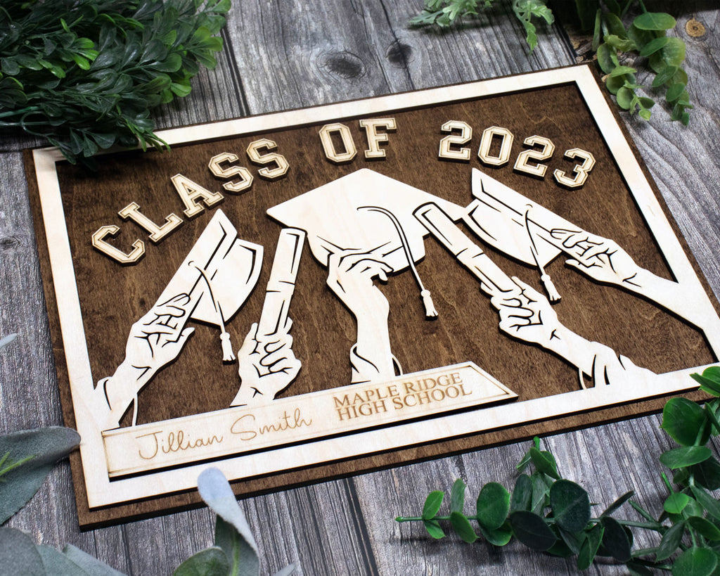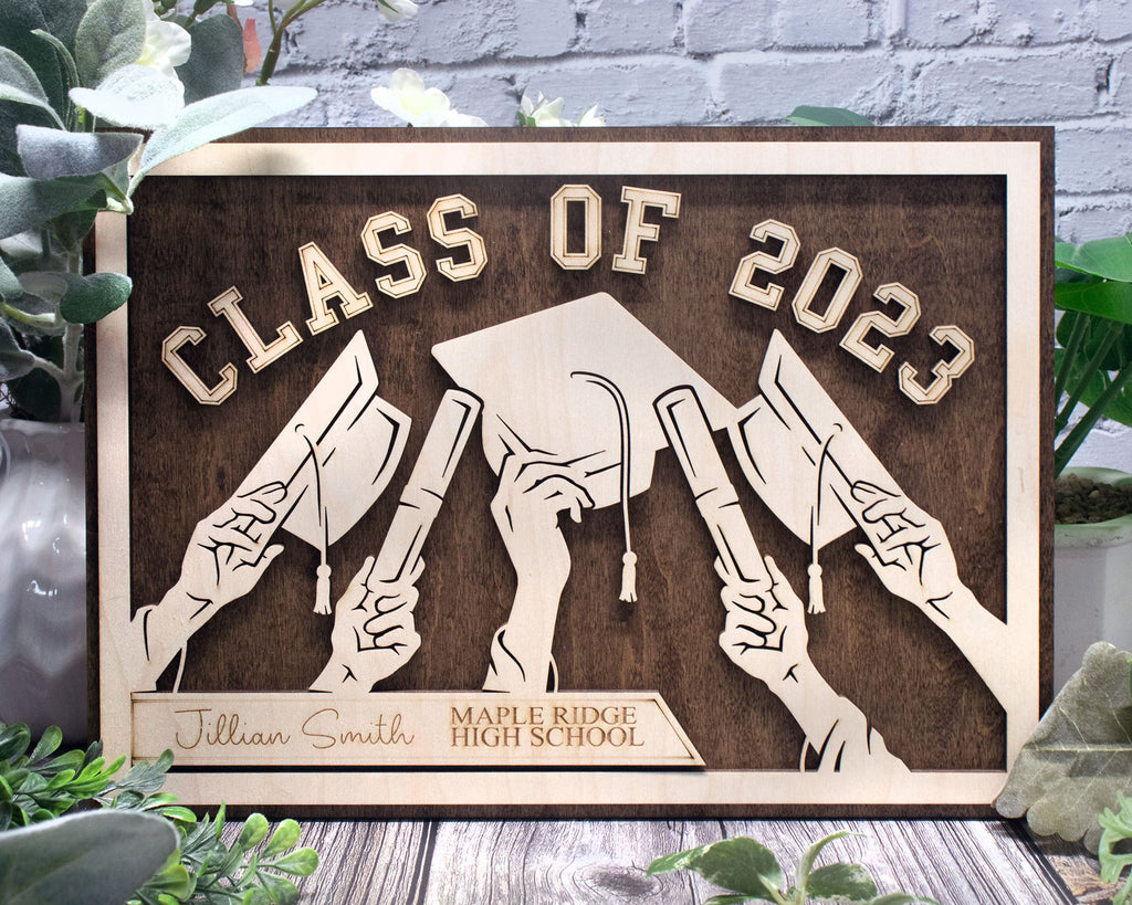 Display your class pride with this two layer design. Painted or not, these are sure to be a hit with your graduate! If you choose paint, let us know what color you’d like and the school’s name so we can get the color right! These measure approximately 10” wide and come with an easel style stand.