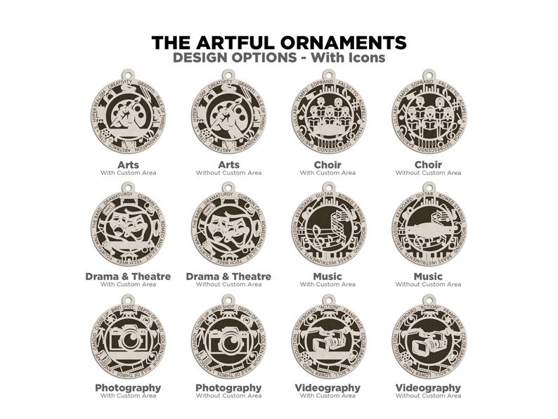 Elevate your holiday decor with The Artful Ornament Collection. With six captivating themes – arts, choir, drama, music, photography, and videography – this collection embodies the essence of artistic expression. Choose between single or double layers to suit your style. Each ornament offers the choice of including icons or keeping it simple, along with customizable options. Let your passions shine and transform your tree into a canvas of creativity with The Artful Ornament Collection.